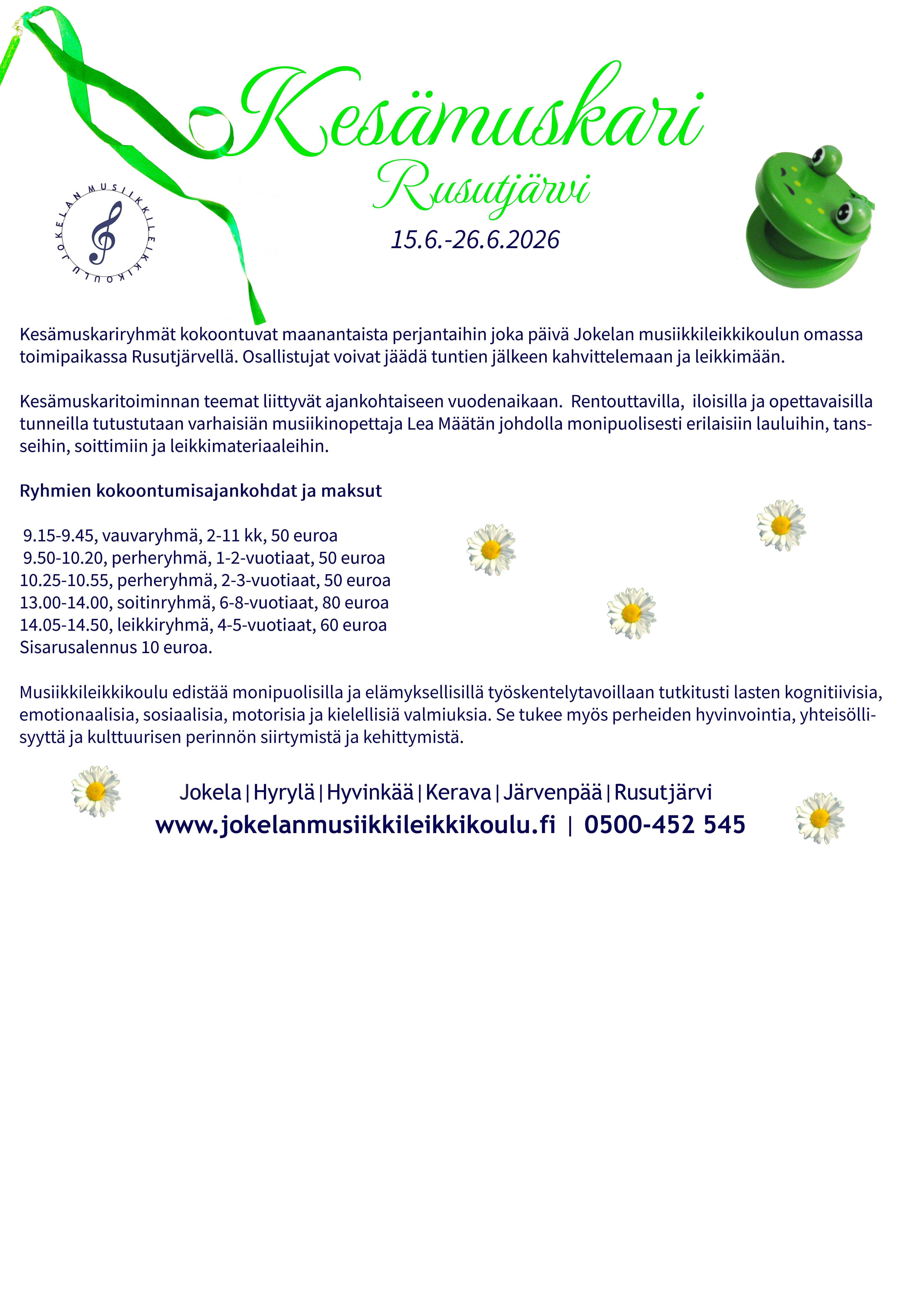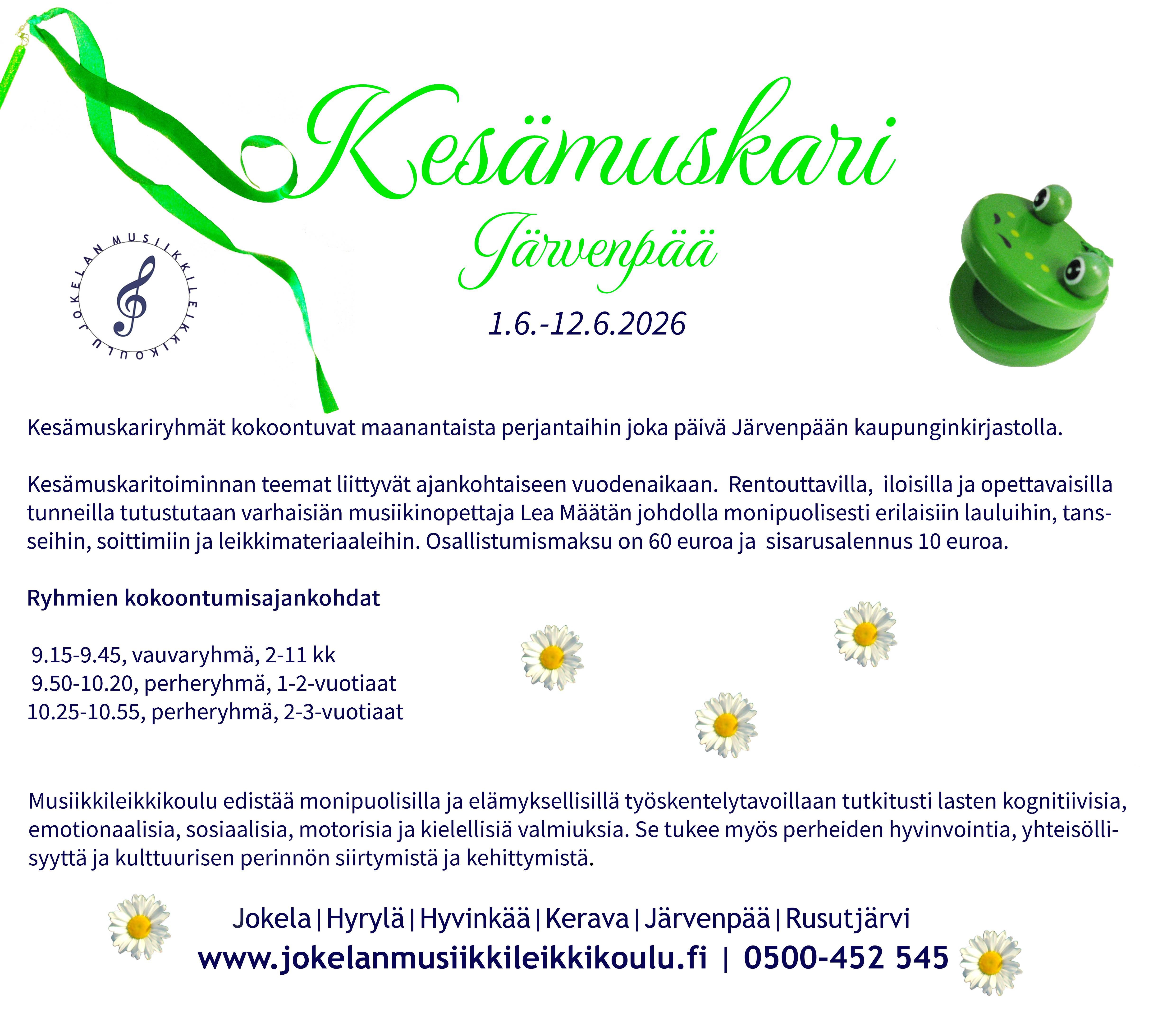Jokelan musiikkileikkikoulu järjestää taiteen perusopetukseen lukeutuvaa ammattitaitoista ja laadukasta musiikin varhaiskasvatusta, muskari-, soitinvalmennus- ja pianoryhmiä 0-10-vuotiaille lapsille. Toimipaikkojamme Keski-Uudellamaalla ovat Jokelan lisäksi Tuusulan Rusutjärvi (Hyrylän ja Nurmijärven kirkonkylät lähialueineen), Hyvinkää, Järvenpää ja Kerava. Lue lisää tästä.